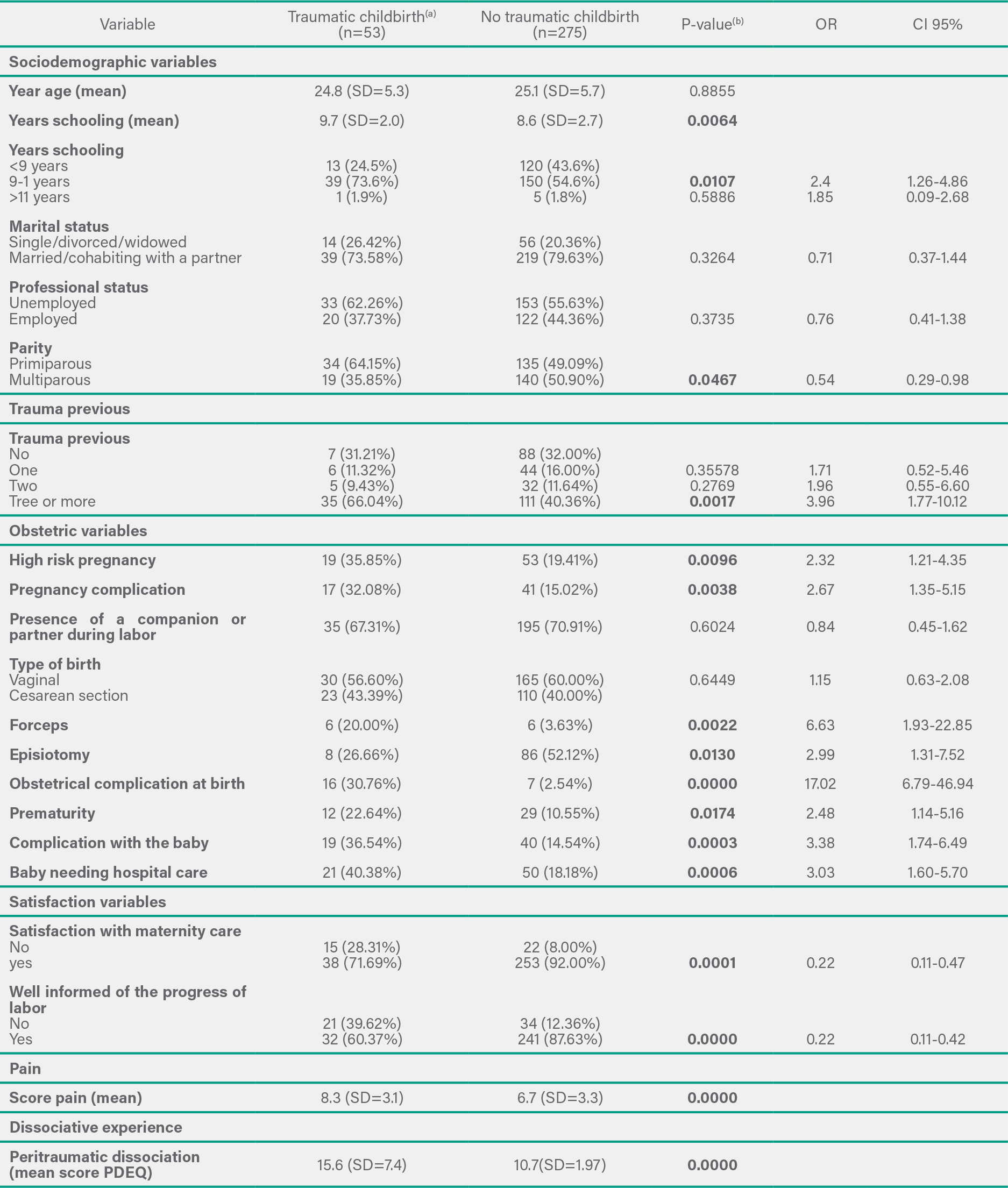 Socio-demographic and obstetrical variables, pain score, previous trauma and dissociative experiences in women with and without traumatic childbirth were compared. Fisher's exact test/chi-square test was used to compare categorical variables, and Mann-Whitney/Student´s t test to compare continuous variables. The comparative analysis of quantitative variables (mean/median), was employed the Shapiro-Wilk for testing the assumption of normality of the variables involved in the study. Therefore, was employed the Student's t-test, when observed the assumption of normality, so when the assumption was violated was employed the Mann-Whitney test. The comparative analysis between qualitative variables was applied the chi-square test, or the Fisher exact test when the chi-square has been violated. The Odds Ratio and 95% CI were calculated for the variables. All differences were tested with a significance level of 0.05. Data were analyzed using R v2 version 10.0.