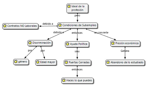 O situaciones en las que después de abandonar una fuente laboral, ya no pudo mantener su nivel de ingresos: “…sé que si ahora intento vivir de mi profesión no lo lograría, ahora debo hacer un negocio, otra cosa que me llene los bolsillos…”. Este tipo de respuestas ante la imposibilidad de conseguir los ingresos necesarios y tender a realizar otra serie de actividades no relacionadas a su profesión, se conoce en la literatura como los shitfers (Simosi, Rousseau y Daskalaki, 2015) , razón por la cual uno debe decidir si obtener ingresos buscando o esperando un trabajo o actividad relacionada con su carrera o más bien elegir algún tipo de actividad diferente que le permita generar ingresos: “….conozco colegas con una capacidad impresionante que en realidad no viven la realidad que su capacidad merece. Por ejemplo hay gente que tiene una capacidad y formación sorprendente pero que hasta ahora no encuentra un trabajo, uno solo”, lo cual se convierte en una espiral de subempleo /desempleo que puede retrasar el ingreso a una fuente laboral, debido a no poder obtener la ansiada experiencia “en el área”, que muchos trabajos solicitan como requisito.